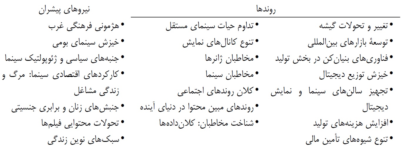 در تحلیل روندهای آیندۀ صنعت، تقسیمبندی سهگانهای که در ادبیات صنعت سینما رایج است استفاده شد: تولید، توزیع و نمایش؛ که در خلال پروژه به اجزاء جزئیتر تقسیمبندی شد. روندهای حاکم بر آینده نیز عموماً در قالب دستهبندی سیاسی، اجتماعی، اقتصادی، زیستمحیطی، قانونی و فناورانه گزارش میشوند؛ که البته در سناریوهای جهانی سینما، از نیروهای زیستمحیطی (بهدلیل جزئی بودن اهمیت آن) صرف نظر شده و نیروهای سیاسی و قانونی نیز، در ذیل نیروهای ژئوپولیتیک بررسی شد. میتوان ادعا کرد که این روندها، تحولاتی هستند که توسعۀ صنعت سینما را در آینده نیز تحتالشعاع قرار خواهند داد و در اثر بروز آن ها، بخشهایی از زنجیرۀ ارزش در صنعت سینما دستخوش تحولاتی خواهند شد. مثلاً با در دسترس بودن فناوریهای تولیدی، محتوای ویدئویی در بازار بهوفور یافت خواهد شد و این میتواند تولید فیلمهای سینمایی را با چالش مواجه کند: فیلمسازان باید بتوانند محصولی تولید کنند که برای مخاطب جذابتر از ویدئوهای شخصیساز باشد. همچنین با وجود تحولاتی که پیش روی این صنعت است، بازیگران این صنعت، از استودیوها گرفته تا مراکز توزیع، گونههای جدیدی از رقابت را تجربه خواهند کرد و در نهایت رفتار مشتری نیز متفاوت خواهد بود. همچنین بی حد و مرز بودن اینترنت، ساختارهای درآمدی موجود در زنجیرۀ ارزش در صنعت فیلم را به چالش میکشد؛ یعنی با وجود دانلود غیرقانونی، کسب درآمد از توزیع محصولات دیجیتالی، چندان ساده نخواهد بود. توزیعکنندگان، برای کاهش کلاهبرداری و تماشای غیر قانونی فیلمها، باید زیرساختهای امنیتیِ جدیدتری را فراهم کنند تا بتوانند از طریق کانالهای امنتری که امکان دزدی اینترنتی در آنها حداقل شده است، محتوا را به دست کاربر برسانند. بنابراین تحولات آینده، نه تنها تجربۀ مشتری را، بلکه آیندۀ کسبوکار در صنعت را نیز متحول خواهد ساخت.